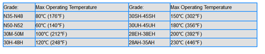 What’s the working temperature for various grades of Neodymium magnets?